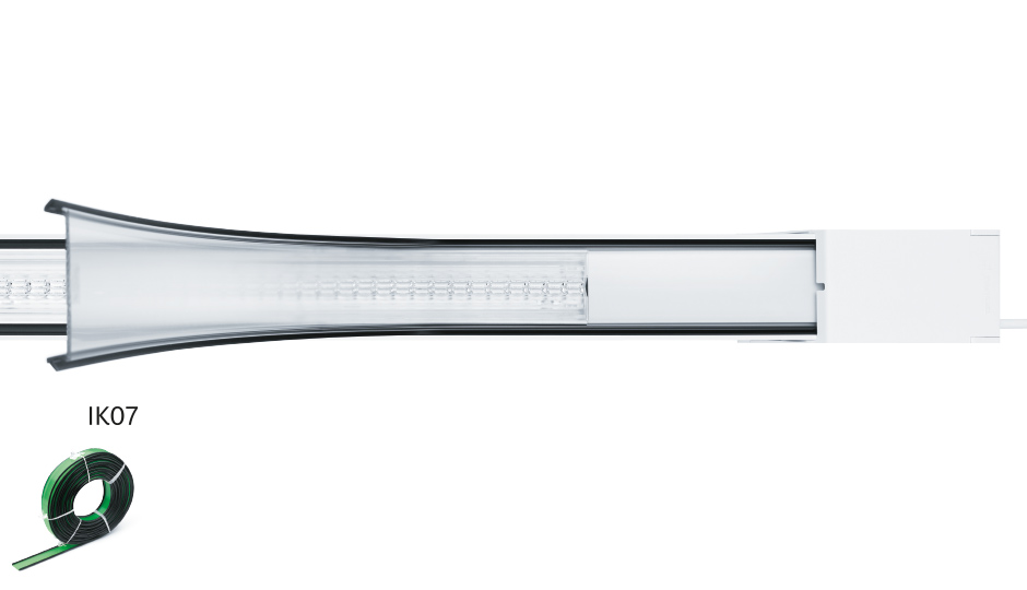 Rollable continuous optics on the underside of the luminaire provide the perfect seal for the whole length of the system