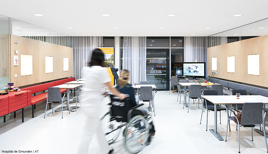 La segunda etapa de ampliación y renovación del Hospital Regional de la Provincia de Alta Austria en Gmunden es una muestra de la nueva percepción en el sector de la salud pública. Conforme a la premisa de „la mejor asistencia médica en centros modernos“ surgiría un complejo formado por edificios existentes y nuevos. Las zonas verdes de las unidades de cuidados circundan al hospital y aportan un ambiente de privacidad y tranquilidad. También en el interior impera el espíritu de la nueva era. El rehabilitado Hospital Regional de Gmunden ahorra más del 60% de energía gracias a un control inteligente de la luz. Hasta las 3.500 luminarias y 500 persianas se controlan por DALI en función de la luz natural. La compleja técnica permanece oculta a pacientes y visitantes. Solo el efecto de la luz es sentido por todos: la armonía de las finas líneas luminosas y la luz indirecta en colores sosegados. Los pasillos y áreas públicas, provistos de luz abundante, crean un ambiente grato y sugerente. Las habitaciones de pacientes siguen igualmente la corriente de modernización: la combinación arquitectónica de los cabeceros de cama individual Pureline y las unidades de atención médica Conboard facilita la benéfica iluminación básica y la seguridad médica.