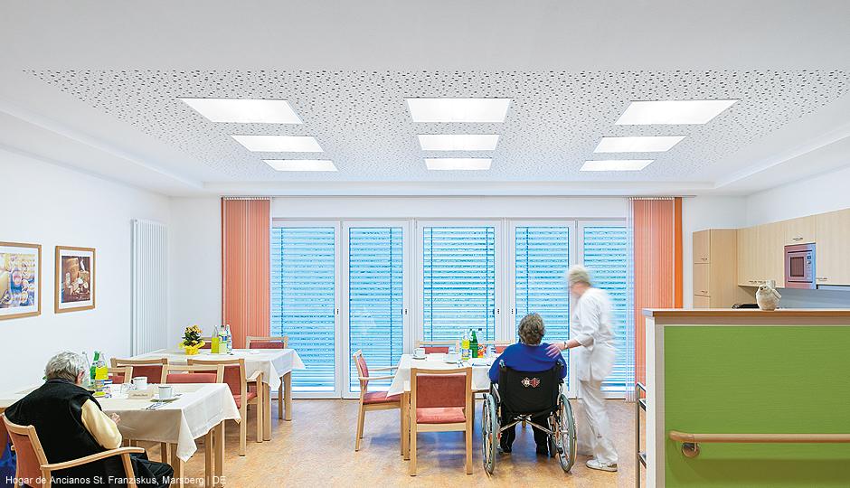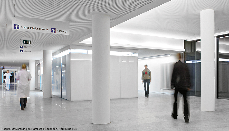 El efecto psicológico de la luz va ganando cada vez más importancia en los hospitales y centros de atención sanitaria. Una muestra del pasado reciente es el Hospital de Santa María, el cual, en el nuevo edificio de su Centro Interdisciplinario de Emergencias y Operaciones (INO), sorprende con sus conceptos de luz y color hechos a la medida. Una fachada revestida con paneles de cristal de colorido brillo recibe a los pacientes. También en el interior, superficies luminosas forman las columnas portantes. Se han elegido expresamente tonos que, en la teoría de los colores, representan la vitalidad y el optimismo. Acudiendo al amarillo, naranja y rojo, este centro médico, que con sus 500 camas es el mayor hospital confesional de Hamburgo, reitera su misión de cuidar de los enfermos con corazón.
