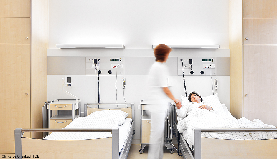 La nueva sección de la Clínica de Offenbach se caracteriza por una infraestructura ideal para los trayectos de pacientes gestionados por procesos, un avanzado equipamiento médico-técnico, un diseño perfectamente estudiado, así como por sus innovadores conceptos de colores, materiales, iluminación y espacios libres. La planta en forma de peine brinda flexibilidad para los cambiantes procesos de trabajo y permite cortos recorridos, además de ser ampliable y, por ende, adaptable al futuro. Los principales papeles de la luz radican en el apoyo a los empleados en sus tareas por medio de luminarias de alta calidad y libres de deslumbramiento, el estímulo de la recuperación en las habitaciones de pacientes y la facilitación de la orientación a los visitantes mediante inteligentes soluciones de iluminación.