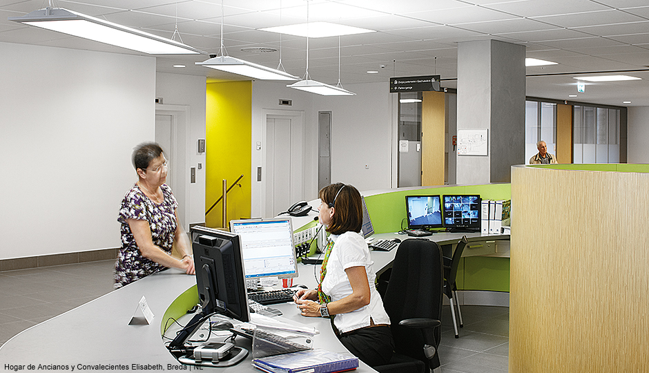 Para una iluminación general uniforme de efecto tranquilizante, en la entrada y los pasillos se instaló el sistema de tira de luminarias TECTON TETRIS. La óptica de cartelas, con su característica de iluminación indirecta, aporta un alumbrado adecuado a los techos, sin deslumbramiento. Una iluminación general de equivalente calidad en las salas comunes, oficinas y zonas de elevadores es obra de la familia de downlights PANOS y la luminaria de oficina LUZ SUAVE IV.