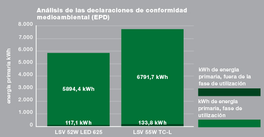 El ejemplo presentado en el gráfico ilustra el proceso de desarrollo de los productos. Se observa que la luminaria LED presenta un impacto medioambiental menor al de la luminaria comparable provista de tecnología convencional de lámparas.